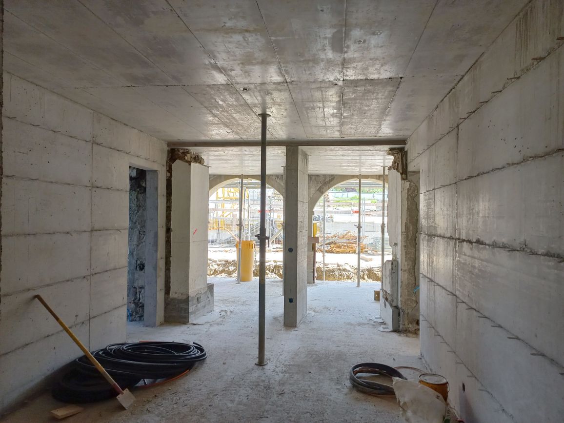 à la suite de la démolition intérieure, un terrassement a été réalisé à l’intérieur du bâtiment, accompagné de reprise en sous oeuvre de certains murs en moellons d’origine et de la réalisation d’un nouveau système d’évacuation des eaux adapté à la nouvelle utilisation de la ferme.